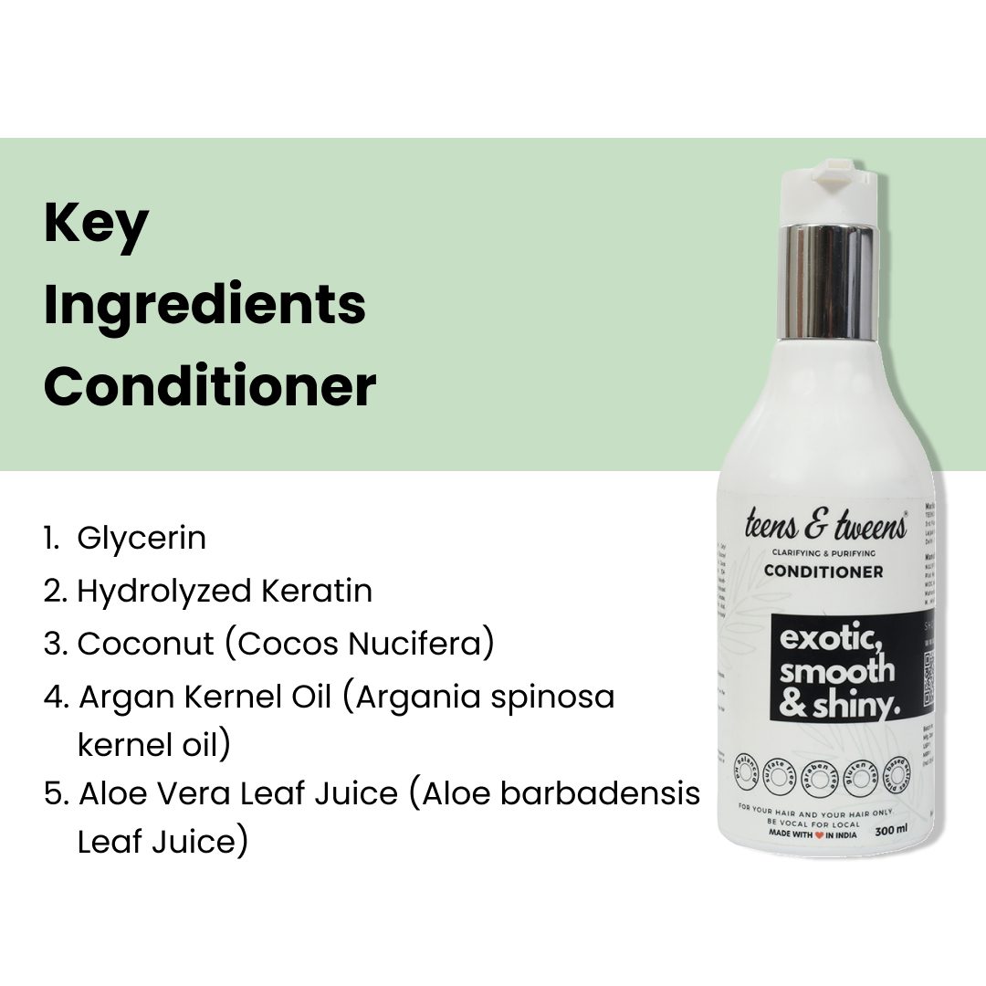 teens & tweens presents the Clarifying & Purifying Hair Conditioner, the key to vibrant, healthy hair for children aged 7-18 in India. Committed to safety and effectiveness, our brand offers paraben-free, sulfate-free, and pH-balanced (4.5-5.5) products crafted from plant-based actives. Bid farewell to dull, oily hair! Our unique hair conditioner is specially formulated to promote better shine, hydration, moisture retention, and reduction in frizz. It perfectly complements our Clarifying & Purifying Shampoo, ensuring your child’s hair stays soft, smooth, and protected. Experience the magic of teens & tweens Clarifying & Purifying Hair Conditioner and embrace naturally beautiful hair every day.