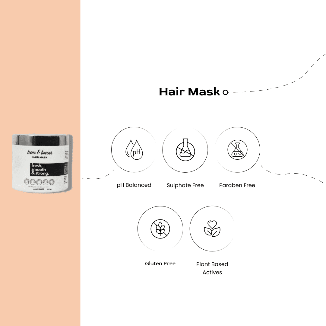 teens & tweens presents a Hair Mask specially crafted for Teens and Tweens aged 7-18 years in India. Our products are paraben-free, sulfate-free, gluten-free, and pH balanced, made with gentle plant-based ingredients, and free from harsh chemicals. Our hair mask is formulated to cleanse, strengthen, and revitalize young hair, leaving it lustrous and manageable, it’s the perfect at-home hair spa experience. Make every day a great hair day with teens & tweens, your go-to brand for the best hair mask.